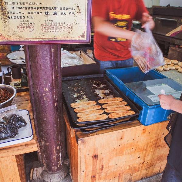 “袜底酥”是同里镇传统茶食之一,清新松脆、甜中带咸。 刚出炉的“袜底酥”香气四溢,循着油面混合芝麻的清香,就可以在古镇实地寻找到这种平民点心。 据说,宋朝有个皇帝,出巡时没胃口吃饭。妃子急坏了,就找...