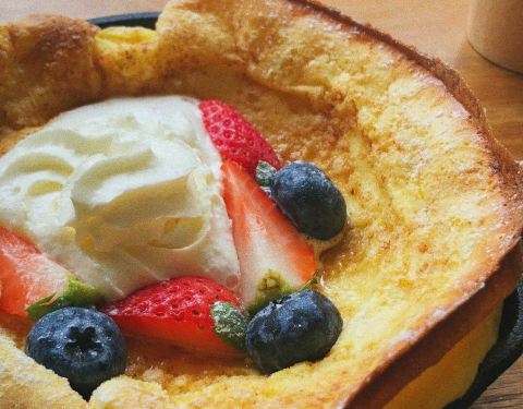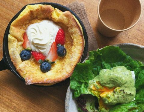 牛油果班尼迪克蛋全餐 是我喜欢的味道了!班尼迪克蛋上面的酱感觉有点芥末味有点蒜香味,入口很丰富,蛋煮的也是刚刚好那种,沙拉的酱汁咸酸适中,就是下面的黑面包吸足了酱汁会过咸了,下次可以考虑把面包放上面。 荷兰宝贝松饼 来之前最期待然后让我最失望!!等了一个小时才上桌,然后铁盘什么都很烫,这种状态下放了草莓和蓝莓,都烫熟了感觉...然后硬挤上去的奶油化了,有点沸腾...松饼口感也不是很好,完全是蛋饼的口感,两分钟时间塌的乱七八糟,失望了!