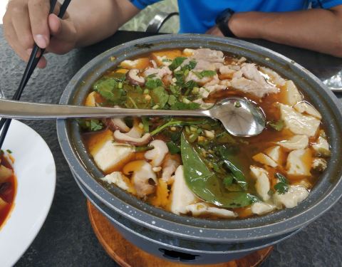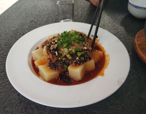路过这里远远看见这个豆花山庄非常气派,就进去试试。点了份招牌豆花,牛肉烧笋还行吧。就是比较辣。