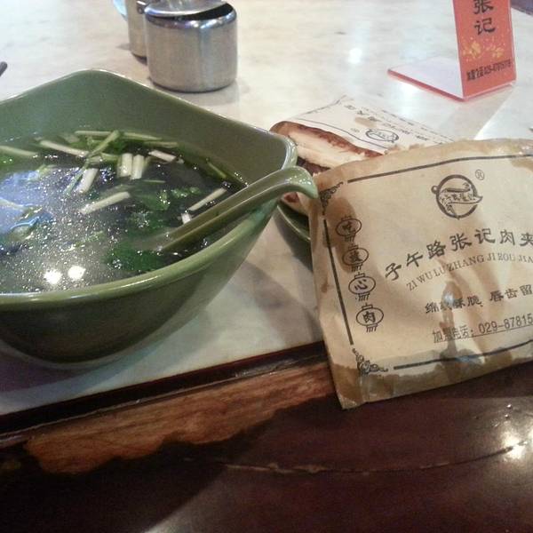 从博物馆出来就马不停蹄的赶去不远处的子午路张记肉夹馍,馍很好吃,皮脆脆的,肉么就。。。好想吃蔬菜了= =+ 这店里还有什么丸子汤、哨子面、腊汁肉,但是没有坐下来慢慢吃,得继续赶路了。不得不提前一晚姐给我...从博物馆出来就马不停蹄的赶去不远处的子午路张记肉夹馍,馍很好吃,皮脆脆的,肉么就。。。好想吃蔬菜了= =+ 这店里还有什么丸子汤、哨子面、腊汁肉,但是没有坐下来慢慢吃,得继续赶路了。不得不提前一晚姐给我们带的肉夹馍,虽然冷了,但是很感动,谢谢姐