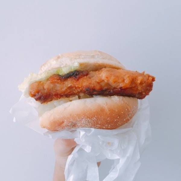 里面夹着有满满的两大块炸鸡,肉感十足,这个一定要趁热赶紧吃,不然鸡肉就会被捂到,炸鸡不太脆,就会影响到口感,肉质会有些许软,没有脆脆的嚼劲了。【夏威夷菠萝鸡腿堡】
