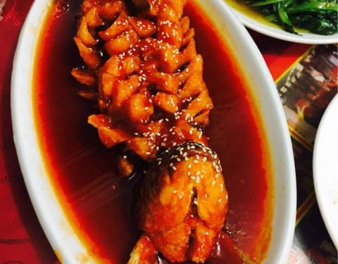 - 菜的味道不错,份量也足,我们一家三口点了一盆麻辣鱼,一份干锅鱿鱼,一份扣肉。老板也热情服务也客气