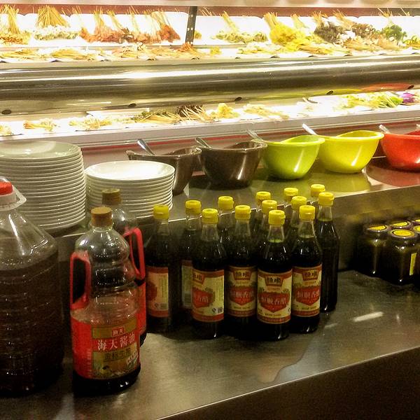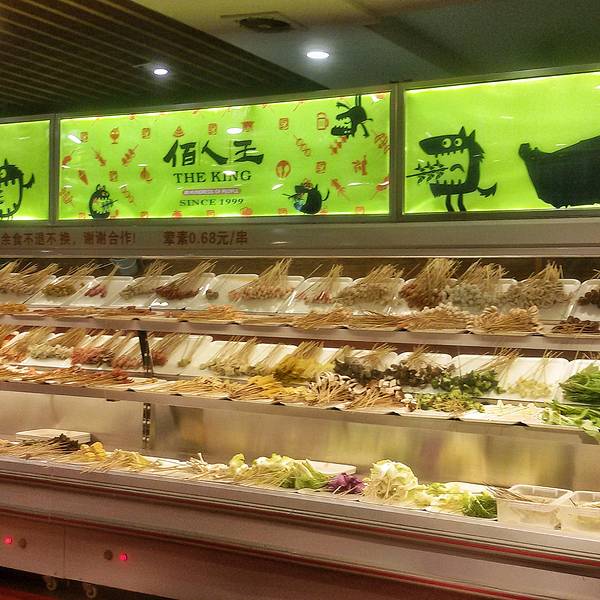 西安一家老店了,开了许多年,现在分店也差不多遍布了西安的东西南北郊。这种餐厅里的串串店,让人吃着就多了几分安心,当然不可否认,还是路边摊的串串味道会更胜一筹。这家串串店是全天开放的,晚上看完电影,顺路就来这边撸个串,因为已经吃过了晚饭,所以也不是特别饿,也吃不下特别多的东西了,这种时候,来几串麻辣十足的串串可谓是夜宵的最佳选择。不知道是不是由于是周内的原因,再加上已经比较晚了,所以他们家用餐的人不是特别多,位置也比较多,不需要等位。店铺的装修风格还是古色古香,充满了复古的味道。锅底自选,选择了鸳鸯锅,麻辣三鲜各一半。吃串串,肉类当然也是不能少的,选择了鲜切牛肉,肉比较薄,口感比较新鲜,肥瘦适中,建议不要煮太久,不然容易化掉,肉也比较容易煮散。串串是自选的,荤素一律6角一串,颇有路边摊的味道,而且他们家的菜品也比较多,满满的一列都是各种蔬菜、鱼丸、豆制品、香肠等等。牛羊肉是盘装的,这个是需要单点的。每一串的菜量都比较小,我们两个人点了30多串,还是感觉不太够吃。菜品还是很新鲜的,而且选择很多,想要吃的喜欢吃的都可以在这里找到。有些菜品上面店家还细心的贴了标签,帮助大家做选择。料碗是自助的,有十几钟调料,自己调制,用的调料也都是家里做菜常备的。餐具也是要自助的,自己从消毒柜中取碗筷和漏勺,感觉服务方面还是稍有欠缺,需要加强。