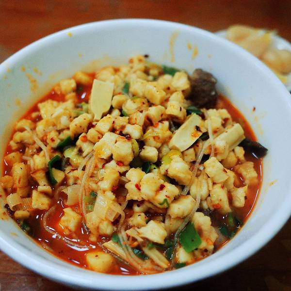 个人觉得生肉小炒好吃。从口味上感觉现炒的生牛肉有鲜味,有花椒浓郁的麻香,酸辣爽,馍筋,肉多切香浓