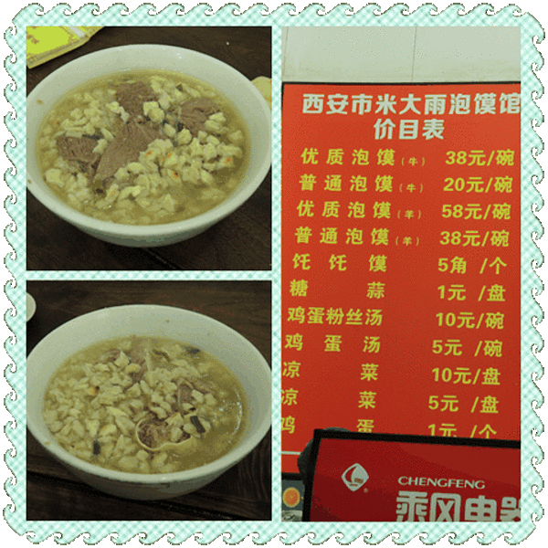 这碗老米家的羊肉泡馍让我很是受伤,回民街好多老米家也不知道哪家是正宗的,还分优质和普通泡馍,优质的一碗38大洋啊!作为一个严谨的吃货,本宫(请允许偶这么称呼自己,哈哈,宫廷剧中毒太深)耐着性子整整掰...