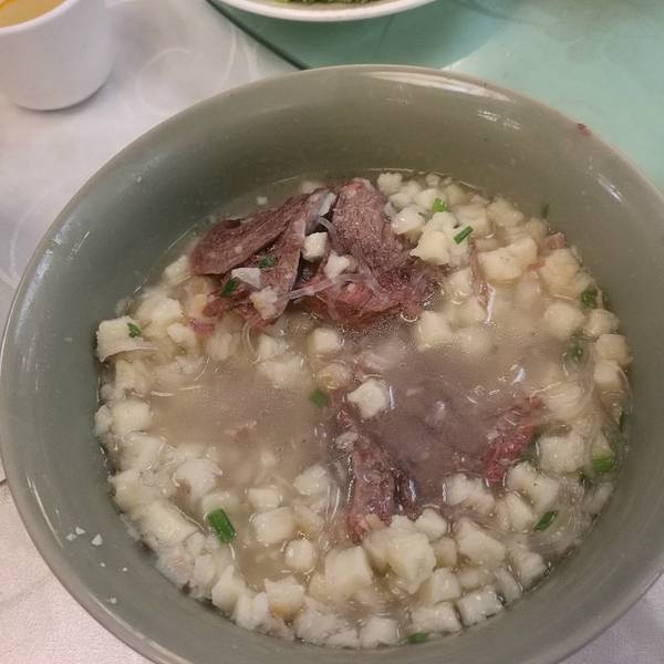 装修风格很复古,木质的大方桌,古装片里的条凳,人多且杂店员会提醒你看好自己的物品,并且会给放在旁边的购物袋之类的加个盖巾,虽然算是贴心服务,不过对于刚在火车上丢了唯一的行李的我来说,变得更惊慌了。泡馍22一份,牛肉60,点完餐会上来一个碗里面两块馍,看攻略说馍要掰成小块才好吃。掰完这两个馍用了20分钟,为了吃要付出代价的。掰完的馍碗被标上号码,以确保你最后吃到的是你自己掰的馍。