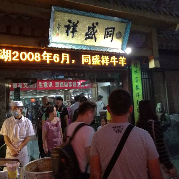 位于鼓楼东大街,鼓楼旁边,要上楼梯,上面最热闹的就是这家,同盛祥的泡馍被评为国家非物质文化遗产,连馍上面都印着字,除了logo还有非物质文化遗产的字码,绝对的招牌。