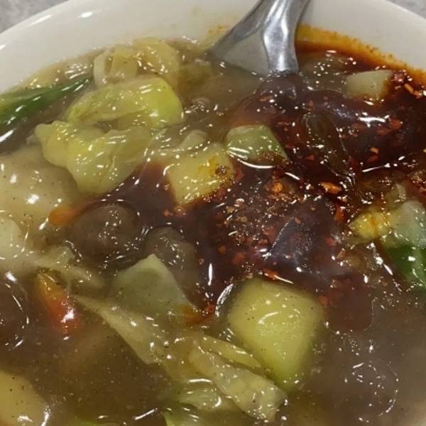 这碗胡辣汤真挺好喝的,做的更为浓稠,丸子比李四那家的好吃,土豆少一些蔬菜多一些就带出了蔬菜的甜,拌上辣子吃,香