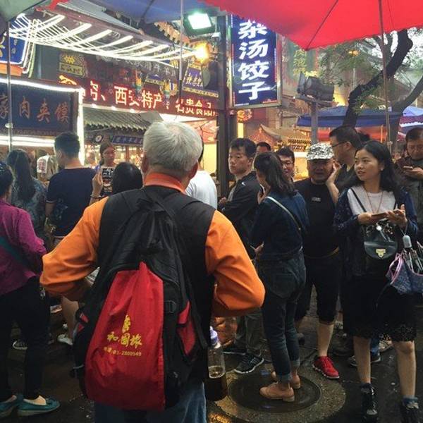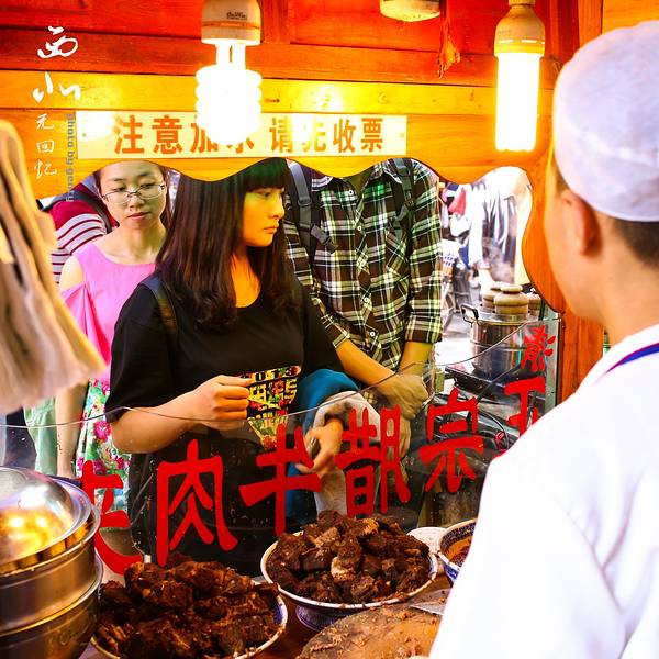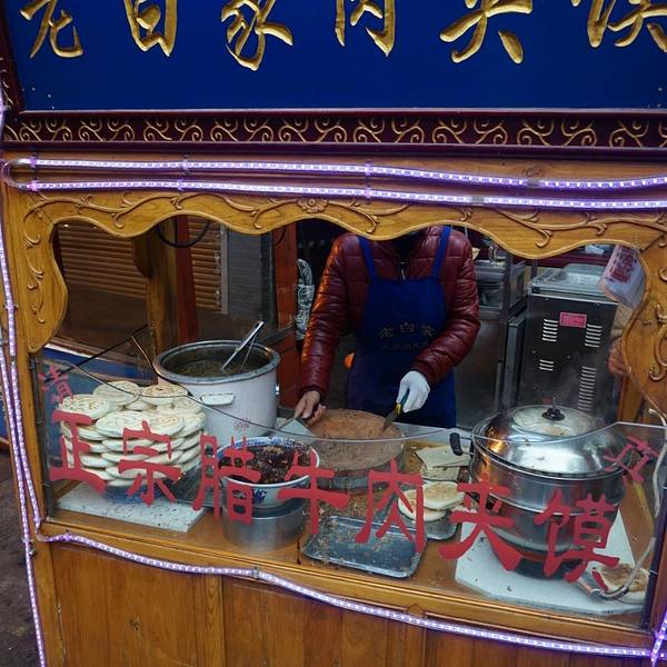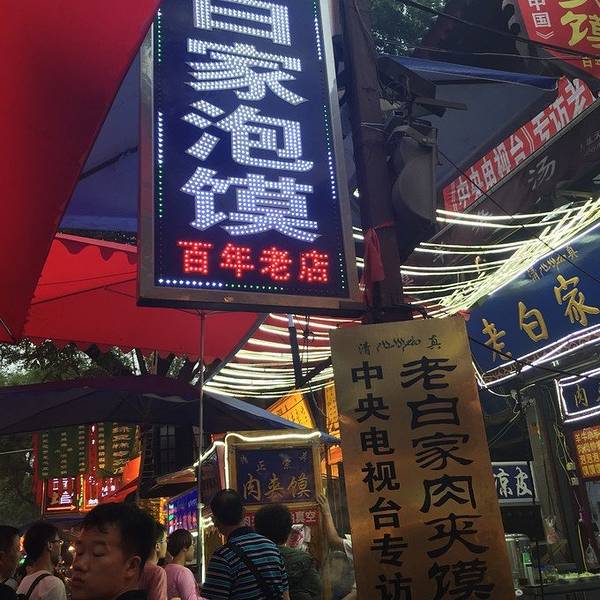 老白家肉夹馍,这是在回民街看到的唯一一个排起长队的地方,肉给的很足。