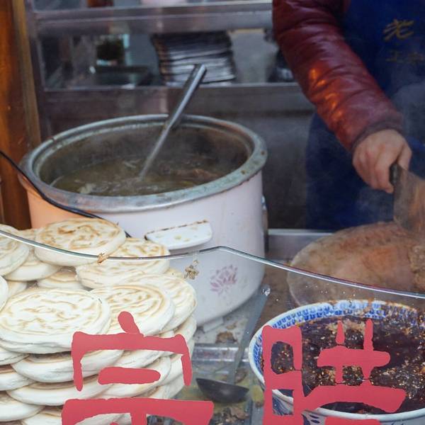 到这也才走了100米而已,但是已经抑制不住想吃的欲望了,看着前面排起的长队,也毅然决然奋不顾身的跟着排了起来…… 老白家 肉夹馍,单点肉夹馍带走的,需要在门外排队等候,如果进店再点些其他一起吃,就不用等啦。直接上上上……我跟赫哥要了2个肉夹馍,一碗羊肉泡馍。