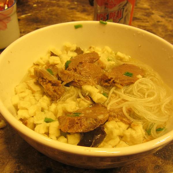 - 后厨返回来的羊肉泡馍成品,好像牛肉的更好吃些。这个就是牛肉的,小炒相当好吃,对 我一个人吃了两碗