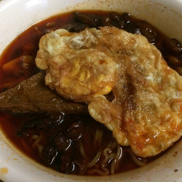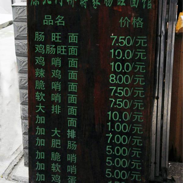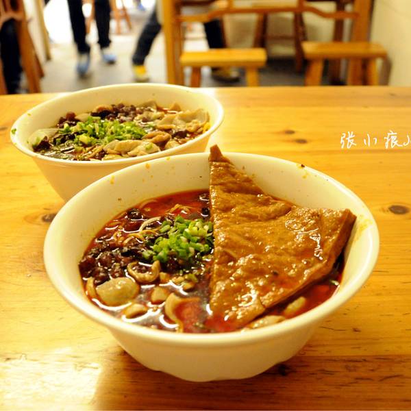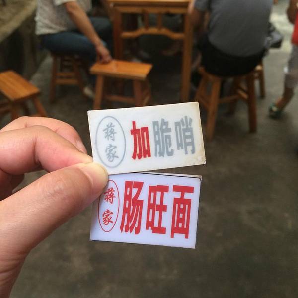 谢过小妹,很快找到蒋家。门洞进去别有洞天啊。那个队比牛肉粉还要长,还有各种拼搭组合。像我这种不碰大肠的,也有非大肠类可填肚子。肠,顾名思义,猪大肠;旺,是猪血;哨,分脆哨和软哨。劳动人民还充分发挥了聪明智慧,将各种拼搭变成了小卡片,比如,我要的是鸡哨面,加鸡蛋加豆腐,意思是辣鸡面+脆哨+卤蛋+卤豆腐,任君选择,包君满意啊。这碗面吃得何等风雅,食客们坐在竹林下享用美食,真应了那句“君子不可无竹”。后来那碗红油汪汪的脆面实在辣到飞起,我把豆腐和鸡蛋吃完,扒了几口面,就放下筷子了。就等老许点评,她吃完大为赞叹,声称就是她心目中的那碗肠旺面。
