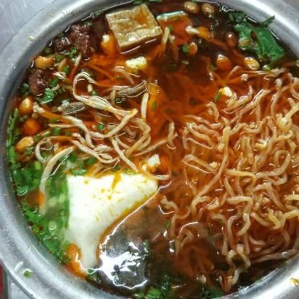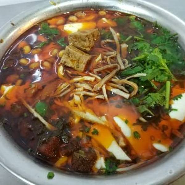 传说中的二十多年的老店,小小的店面长期满座~ 她家的使用的面条与肠旺面一样,而且同样的在面条里加入了脆豆芽,来丰富口感,同样的满满一层红油~ 这几点来说喜欢肠旺面的人,或者说喜欢碱水鸡蛋面的人,一定...传说中的二十多年的老店,小小的店面长期满座~ 她家的使用的面条与肠旺面一样,而且同样的在面条里加入了脆豆芽,来丰富口感,同样的满满一层红油~ 这几点来说喜欢肠旺面的人,或者说喜欢碱水鸡蛋面的人,一定也会喜欢这个~ 而她与肠旺面又是有不小区别的,原味鸡汤作为汤底,撒入肉香更好的软哨,再用干黄豆来弥补脆口,卤豆干来增添卤香,最后在丢入的大块雪白豆花上铺上鸡丝,嫩、软、韧、脆、爽、弹、香,全方位的口感,让你吃的很有意思~ 旁边还有自制的豆豉与超大罐的泡菜供你自助添加~ 我看很多当地人都是,泡菜不离口,豆豉汤里走,吃的开心的很~