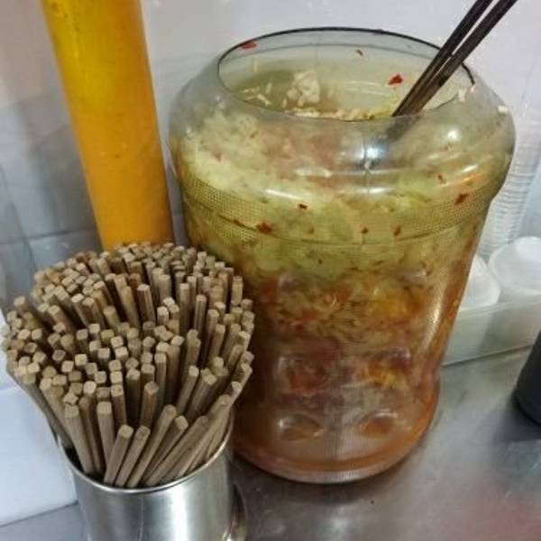 而她与肠旺面又是有不小区别的,原味鸡汤作为汤底,撒入肉香更好的软哨,再用干黄豆来弥补脆口,卤豆干来增添卤香,最后在丢入的大块雪白豆花上铺上鸡丝,嫩、软、韧、脆、爽、弹、香,全方位的口感,让你吃的很有意思~ 旁边还有自制的豆豉与超大罐的泡菜供你自助添加~ 我看很多当地人都是,泡菜不离口,豆豉汤里走,吃的开心的很~