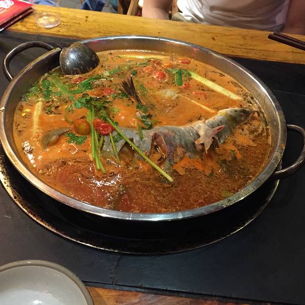 酸汤的酸,并不是靠醋来实现的,而是靠当地的一种小番茄,那种酸没有工业醋的刺鼻或者冲劲,而是一种柔和的酸爽的那种酸,让你食欲大开,忍不住喝一碗再喝一碗。不夸张的说,在开始吃鱼之前,我们已经喝掉半锅汤了……