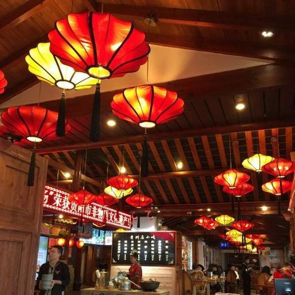 远处可以看到大红色的灯笼,装修风格很有苗家特色,服务员也都穿着漂亮的民族服饰。菜肴色香味俱佳,味道正宗。酸汤鱼是店内必点菜品,也是贵阳有代表性的特色菜。酸汤开胃,鱼肉鲜嫩,味道独特。