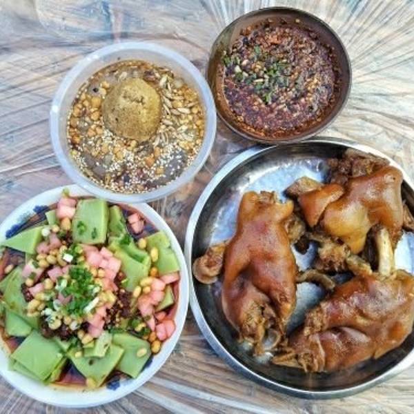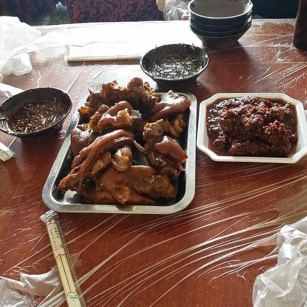 古城外的著名“王万妈卤猪脚”,一行人虽已酒足饭饱,但仍要不迟辛劳的找到这家著名的猪蹄店一吃为快2只猪脚而已...... 就是这么大的一盘,旁边那道是辣椒鸡,味道实在不敢恭维在家从没这么“怂”的吃过肉,味道可想而知
