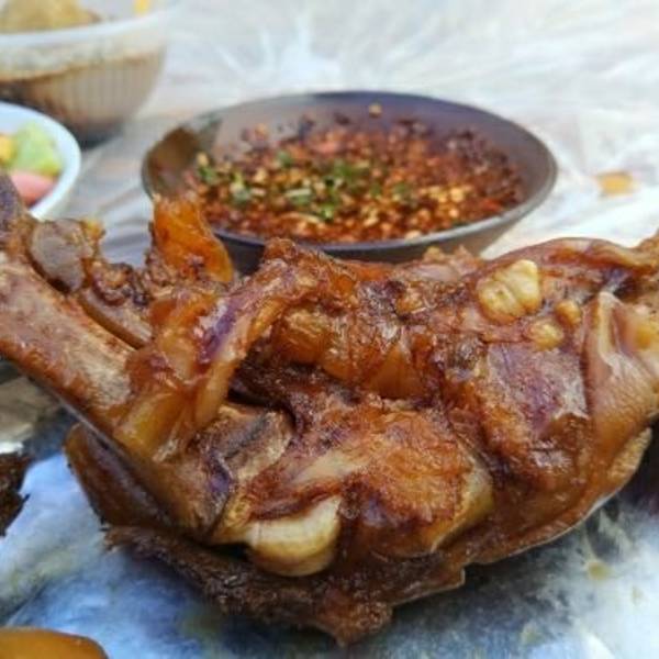 店员都是大姐大妈,拽拽的,懒懒的,爱理不理的感觉。刚好遇上下大雨,进去看到有带棚的户外座位,立马坐下,露天空气比较好,也更为写意。点菜的大姐老师不客气,一过来就拿个椅子坐下来,也不是说普通话的,问...店员都是大姐大妈,拽拽的,懒懒的,爱理不理的感觉。刚好遇上下大雨,进去看到有带棚的户外座位,立马坐下,露天空气比较好,也更为写意。点菜的大姐老师不客气,一过来就拿个椅子坐下来,也不是说普通话的,问她那是什么菜她说了我们也没听懂,只好随便叫。猪脚好像是按只算的,可以先试试好吃再加。猪脚肉很绵软,味道还真的不错,很入味,他们家给的酱可以不加,加了有点咸。其他特色菜式其他地方也可以吃到,每家的口味都有些区别。野菜倒是个不错的选择,平时不经常吃到。加了碗简简单单的汤水,让温暖流遍全身。