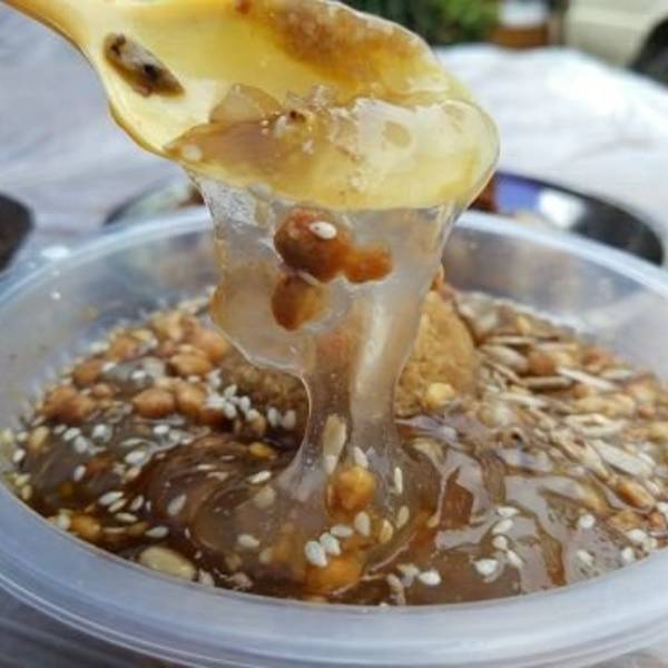 猪脚确实卤的不错,属于超级软糯型,两根猪脚如果贴在一起,猪脚皮便会粘连到一起,扯开之时,能明显的看到皮与皮之间的拉丝~ 放在嘴里,完全就是满口的胶原蛋白~ 吃完之后,嘴唇也是极粘的,我用德宝餐巾纸搽嘴,居然都被粘破了~ 她家还有一味很是好吃,叫做糕粑稀饭~ 与云南调糕藕粉形态很像,但完全不一样的食材与做法~ 将米糕粉填入小木桶,放在特色大方壶上蒸熟,另取一碗,舀上糯米白浆,放到大方壶前方,冲入滚水,瞬间变成似于藕粉的透明羹状,依次放入玫瑰酱水,大量花生与瓜子,最后搭上刚蒸熟的糕粑,水、滑、软、脆、香、甜,相互交织,伴上玫瑰的纯香,超迷人~