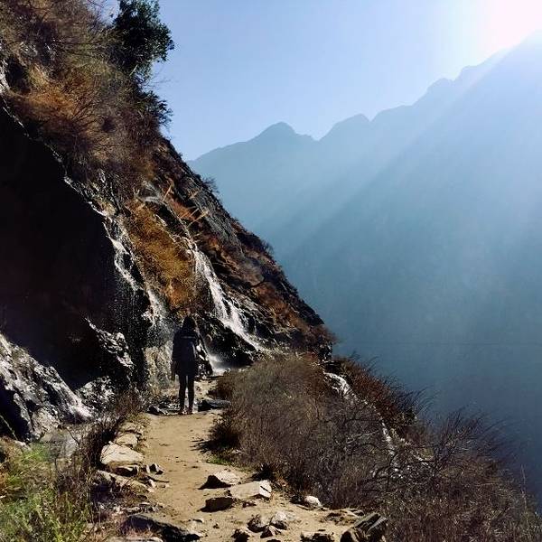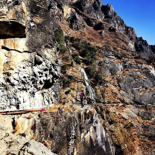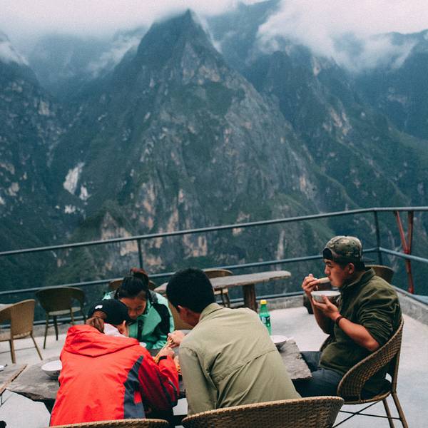 较之它的中文名字“中途客栈”,halfway更为驴友熟知。这里的厕所号称“天下第一厕”,厕所上面的大露台,也美其名曰“爽死你阳台”。老板冯德芳开辟的“哈巴驴道”,曾让很多驴友慕名前往,并在院子里的驴墙上留下得意的一笔。可惜冯老板已经不再带人走哈巴驴道,驴墙也只是曾经的荣耀了。 铺位30元起,标准间80元起。 饭菜物美价廉,味道一级棒,在爽死你阳台用餐,真的是一大享受。 第一天的行程,十分推荐在此住下,休整,再开始第二天的行程。 第一天住这里的人还是很多的,好大一个韩国团队,以及各路的国际友人。 除了我们几个中国人外,还有一个小帅哥过来问我:“请问你是中国人吗,我没带够现金,你能借我一百,我支付宝转给你。” 写到这里,真的好像笑,但也没办法,走这里的中国人真的很少,基本上都是走的景区模式,坐车到景区走马观花便结束了,不来徒步虎跳峡,真的是一大损失。