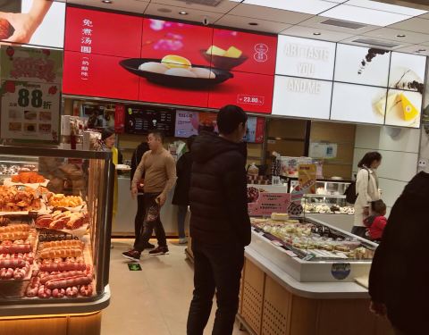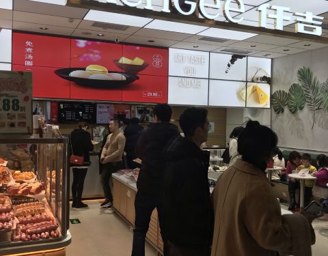 这家店在花园路国贸360商场负一层,仟吉应该是这边生意最好的面包店,每次来买面包的客人都很多,而旁边的多乐之日很少有人去,他家面包种类很多,价格也实惠