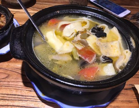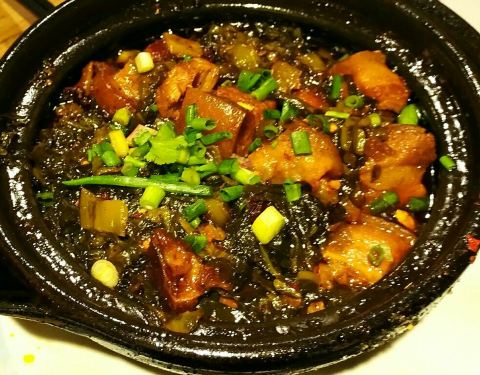 重口味的江湖菜,以沙锅为主,荤素自主搭配。酸菜红烧肉又软又糯,半肥半瘦,与酸菜一起烧制,鲜香爽口。红烧牛肉,稍有嚼劲,肉质鲜美。麻辣肉片类似于水煮肉片,但口感更劲爆。肉末茄子,所有的佐料与肉末的精华都融入了茄子,使茄子的口感除了田园的清新,更多的显示出农舍的纯粹,堪称经典。饭点绝对要等候餐位,等着点餐、付款,然后候坐——待到别的食客吃完,服务员收拾好桌子,落坐后,喝喝重庆的老荫茶,这时,上菜就快了。当然,服务员忙得应接不暇,时不时还要求客人搭把手。店堂不大,食客络绎不绝,就餐环境嘈杂,店面装饰个性,餐具有特色。当地吃货朋友带去的:这是个吃味道的地方!