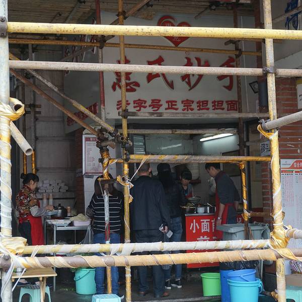 店所在的大楼在装修,外面搭了脚手架,也还是阻挡不了大家的热情,只有三四张小桌子,翻桌很快,我们吃的担担面,味道很好,也不是特别辣