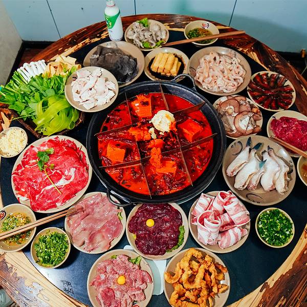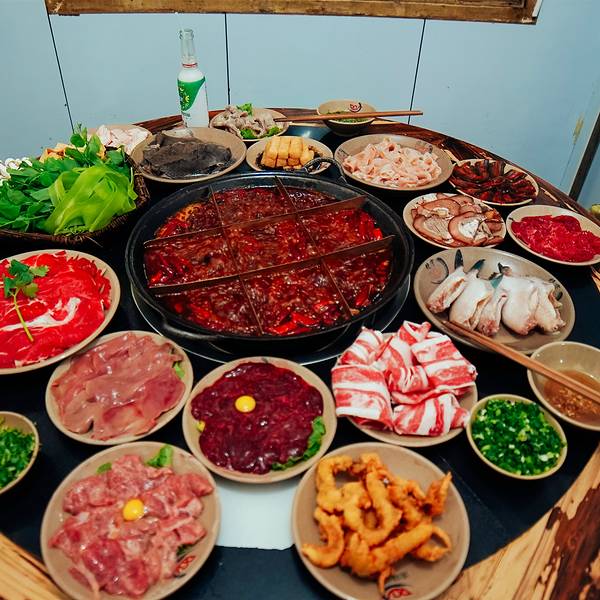 听说我这么爱吃火锅,我本地的重庆朋友给我推荐了这家店,这家是连锁的,我吃的这家是总店。 味道很适中,分量也还行。听口音很多都是本地人,听起来就很安心,有种本地人认证的感觉。火锅底料有微微辣、微辣、中辣……老板推荐外地人吃微微辣,但是最后一天了,我还是斗胆就点了微辣,还好,没有我想象中的那么辣,所以爱辣的朋友们可以点中辣!牛油醇厚,吃完身上都没有味道。我们点了超级多~肉中间还有鸡蛋,下锅前可以把蛋打散,肉蘸取蛋液下锅会非常嫩。阿姨上菜特别快,很热情,问我们会不会烫这些菜,她路过我们的时候都会对我们笑。提醒我们黄喉要赶快吃完,否则影响口感。肉的份量都很大,色泽红嫩,看起来就是新鲜货。鱼的个头可以提起来看看,比手掌还长。秘制毛肚和宽粉必点!很好吃!他们家的食材特别特别特别!新鲜!有种刚从地里摘回来的感觉,哈哈哈有点夸张,但是素菜都非常清爽。 重庆火锅瞬间治好我不吃蒜的毛病,这边的配料很多,可以尽情选择。听说蒜油碟可以防止上火,走起来~最后喝一碗冰粉,爽哉~冰粉配火锅超级绝。 吃完饭我们去最后一个景点