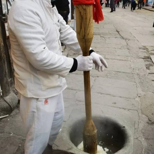 ...一家糍粑店,人超多,围观的人也很多,因为是手工现打的糍粑所以看的人很多,打出来的糍粑还是很好吃