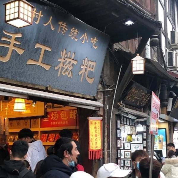 - ...一家糍粑店,人超多,围观的人也很多,因为是手工现打的糍粑所以看的人很多,打出来的糍粑还是很好吃