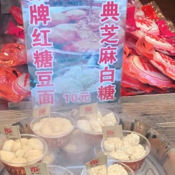 [薄荷]环境:一家小店子,生意还可以。外面有2个人一直在喊顺口溜,很打眼。 招牌红糖豆面糍粑是现做的,是热的。我个人爱吃软糯的东西,符合我的口味。裹上黄豆面,加上热的红糖汁,一口一个。别看碗小,一小碗也能饱肚子了。