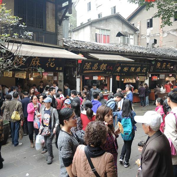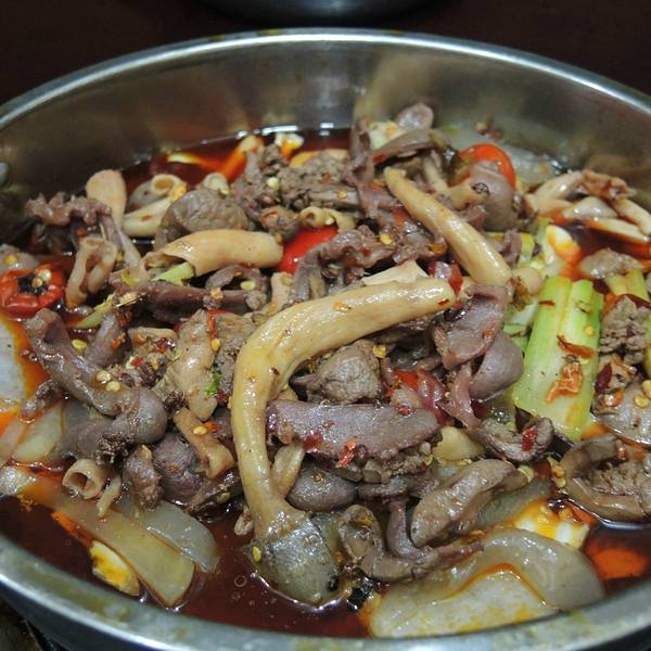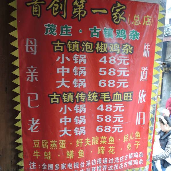 磁器口古镇有一条餐饮街,街里面的饭馆大多以古镇鸡杂和毛血旺为招牌以吸引顾客,搞得大家也不知道哪家正宗。好在我们来前做过攻略,知道了磁器口最著名的正宗鸡杂店里有一家叫茂庄古镇鸡杂,我们就去找他了。总体来说,磁器口的古镇鸡杂还是很值得尝一尝的,味道鲜美,吃着很过瘾!