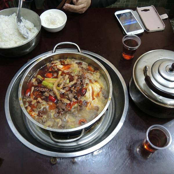 中午溜达到饭点了,也不是太饿,就在磁器口里吃午饭,三个人要了一个小份泡椒鸡杂锅,一共花了77块钱,相当便宜了