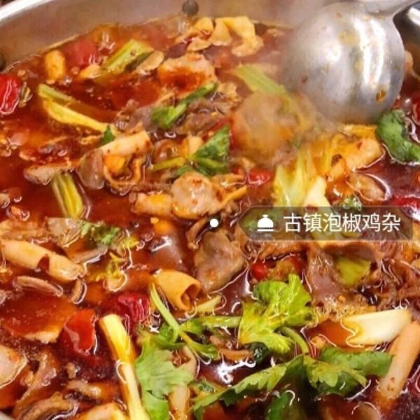 在重庆有句俗语说得好,要吃美食,得来重庆;来了重庆,就要到磁器口。磁器口上一条街的美食,各有各的特色,但是要说鸡杂,整个重庆都找不出几家能跟古镇鸡杂 比的。古镇鸡杂店位于重庆磁器口,乘坐公交148路、 ...在重庆有句俗语说得好,要吃美食,得来重庆;来了重庆,就要到磁器口。磁器口上一条街的美食,各有各的特色,但是要说鸡杂,整个重庆都找不出几家能跟古镇鸡杂 比的。古镇鸡杂店位于重庆磁器口,乘坐公交148路、 222路车到白马凼公交车站下车,沿着正街一路逛过去,很快就能看到 古镇鸡杂 的招牌。店面虽然不大,但是装修得很古朴,给人一种很古朴的感觉;店门口有人吆喝拉客,进店就有店员迎上来,为客人安排位置,拿菜单等,服务非常好;菜品很多,当然鸡杂作为招牌,味道非常的好,麻辣味十足,分量也足,很大一盆子;值得一提的是,店里毛血旺也很正宗哦!当然,磁器口这里毕竟是旅游热地,价格有点偏贵,人均消费五六十元左右! - 这个味道很好吃,特别是里面的鸡杂吃着很有嚼劲,酸萝卜又酸又脆,不错,