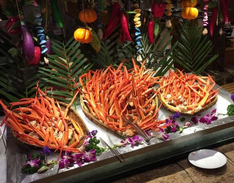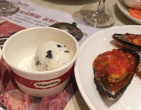 海鲜自助餐,虾蟹三文鱼螺丝扇贝花蛤寿司随便你吃,牛排、生蚝、片烤鸭一人一次排队拿一份,喜欢的可多次排队喽,时令蔬菜水果果汁甜品低度酒,品种很多的,午餐哈根达斯一人一个,还有海鲜小火锅。