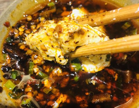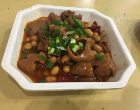 - 再来一份肥肠,压得非常耙很入味,好吃惨了。豆花非常嫩,调和有红椒和青椒两种
