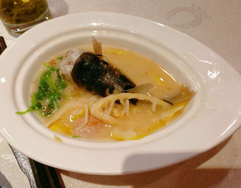 - 这个每人一盅的真是吃到惊艳,鲜浓的汤汁里面有嫩笋,河豚鱼皮粘稠有着丰富的胶原蛋白,鱼肉嫩,下面...
