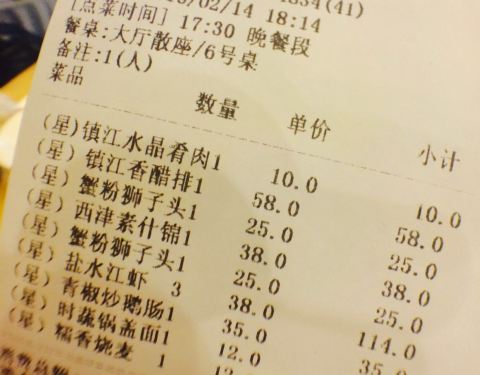 餐厅名字很霸气,不过菜的水准正如点评上的排名。 本来还想吃一顿西津会,可惜12点的时候还要排,就怕赶火车时间来不及,选择了隔壁的镇江菜馆。 点的基本上都是推荐菜,「镇江香醋排」用镇江香醋做的,醋味很...餐厅名字很霸气,不过菜的水准正如点评上的排名。 本来还想吃一顿西津会,可惜12点的时候还要排,就怕赶火车时间来不及,选择了隔壁的镇江菜馆。 点的基本上都是推荐菜,「镇江香醋排」用镇江香醋做的,醋味很浓郁,排骨选的肋排,还蛮好吃的。「蟹粉狮子头」狮子头味道还不错,可惜我是怎么也没吃出来蟹粉,25块一个价钱不便宜,但是没吃过的话点个吃吃不错。「鲜豆皮」用新鲜的豆腐皮做成的,蘸上镇江的酱油和醋配的调料,新鲜Q弹。「红烧江白鱼」鱼肉味道是满嫩的,就是刺稍微有点多,微辣的红烧烧法。 「酸汤肥牛卷」这个菜真是超级怪的口味,而且肥牛的质量不怎么好,用的是比较差的肥牛。 服务员基本都是阿姨大姐们,服务还算过得去吧,上菜速度不错。