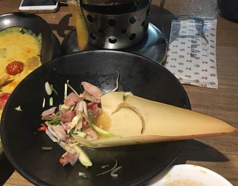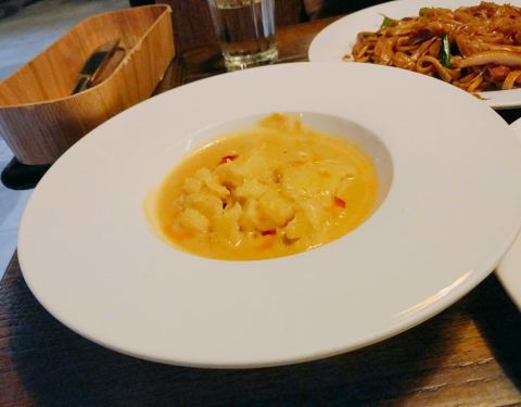 长春最老牌的泰式餐厅,食间旗下的。环境很幽静,进门之后上二楼,还有室内景观,适合约会的场所。这次品尝了两种咖喱,一种黄咖喱,菜式包括香菜黄咖喱虾、黄咖喱牛肋条,黄咖喱香而不辣,适合大众口味,这两道菜都非常好吃,黄咖喱还非常下饭。另外一种咖喱是红咖喱,菜式是红咖喱面包鸡,红咖喱是稍微带点辣口,吃完里面的鸡肉,外面的面包可以沾着咖喱吃。汤类还是推荐最经典的冬阴功汤,味道浓郁。甜品推荐椰子西米糕,爽口不甜腻。