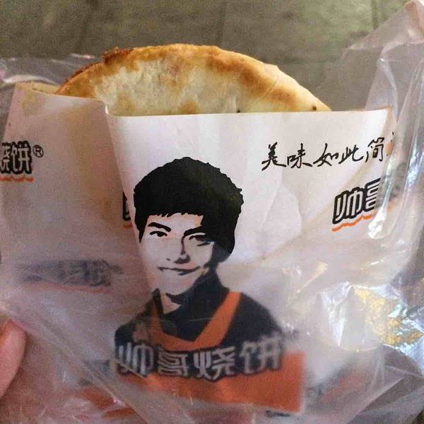在沿街的商铺中有一个熟悉的身影,在早些年录制的旅游节目中都有报道过的“帅哥烧饼”当时就想着,一个其貌不扬的烧饼为什么能够出名到旅游节目专门介绍,看了节目才知道,用意不在饼,还真是在“帅哥”上做的文...在沿街的商铺中有一个熟悉的身影,在早些年录制的旅游节目中都有报道过的“帅哥烧饼”当时就想着,一个其貌不扬的烧饼为什么能够出名到旅游节目专门介绍,看了节目才知道,用意不在饼,还真是在“帅哥”上做的文章呢。 赶着热度凑近一探究竟,用料和感觉上果然没有什么稀奇,甚至可以说一般,但还是抱着游客心态打卡取食,看过旅游节目的都知道,制作“帅哥烧饼”的那位帅哥根本就不是现在做烧饼的这位,不过一个小小的烧饼店已经发展到把老板的帅气形象已经融入了整个烧饼的VI当中,袋子上就是印着那位帅哥的样子,唐尼说,乍一看还挺像王大陆。 言归正传,嗯……味道嘛,我只能说烂大街的手抓饼都比这个好吃,不过价格也不贵,最便宜的6元,招牌的“高富帅”也就10元吧,对于景区店兼网红店来说价格还算实诚,至少比手抓饼便宜。