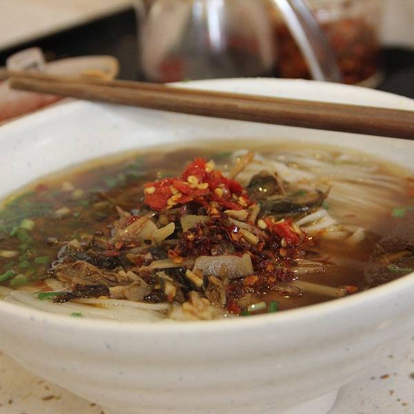 店面在长沙“随处可见”。主打面条,码料多得“难以想象”,汤头“鲜美”,面“硬硬”的,“很有嚼头”。服务员端碗的技术也是一道风景,他们“在手里托个板子,板上放两碗面,面碗上再放板子,板子上再放面……如同盖高楼一样可以叠4~6层”,真令人“惊叹”。