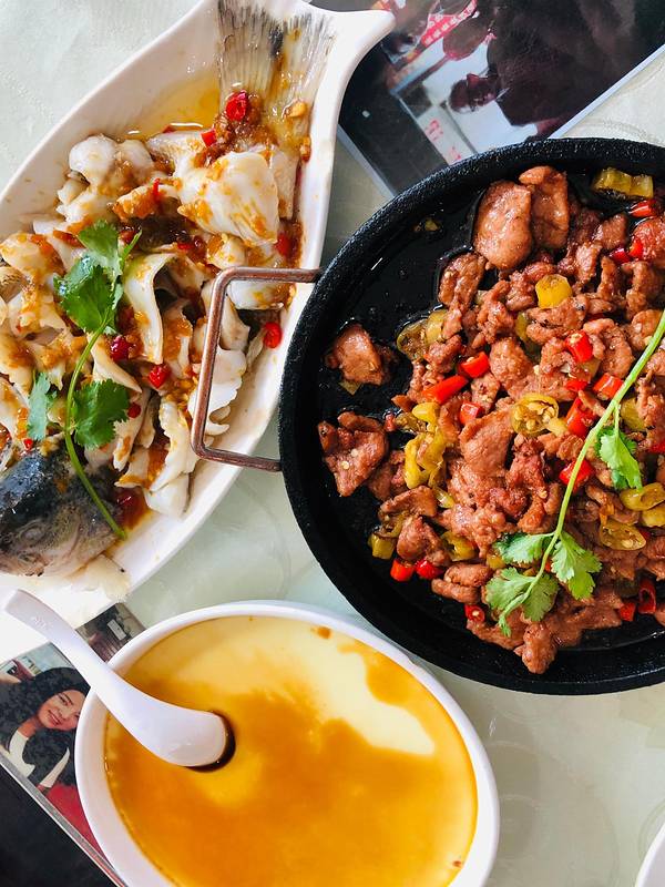 「铁板鹅肉」 点菜全听阿姨推荐,很幸运下午去招牌菜还有,应该是第一次这样吃鹅,还挺嫩的比鸭肉瘦多了,两种辣椒爆炒真的很香很下饭,辣度能接受。这还是小份的仨人吃足够了吃到后面还是油啊。 「米豆腐」 我的...「铁板鹅肉」 点菜全听阿姨推荐,很幸运下午去招牌菜还有,应该是第一次这样吃鹅,还挺嫩的比鸭肉瘦多了,两种辣椒爆炒真的很香很下饭,辣度能接受。这还是小份的仨人吃足够了吃到后面还是油啊。 「米豆腐」 我的老天爷第一回吃真的被惊艳到了,口感挺紧实的跟普通豆腐不一样还有点弹弹的。很家常的一道菜但绝对是这顿饭最好次的。 「糯米蒸排骨」 女票想吃糯米就点啦全是辣菜也真扛不住,排骨蒸选料不错玉米也好吃,糯米油叽叽的。被酱油炒过的糯米更好吃不过这家没有。 「地瓜叶」 在阿姨的塑料普通话和湖南话夹击下点的素菜,正常绿菜水平但还是油啊啊……