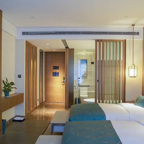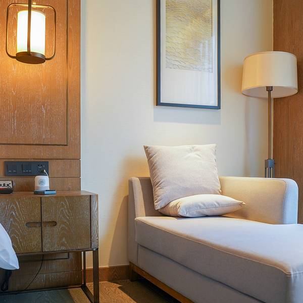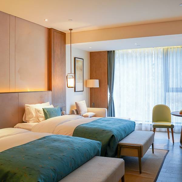 新安雷迪森度假酒店,依新安江而建,背靠南山公园,一边是南山山麓,一边是新安江景,不时传来不远处新安江电站的滔滔江水声,让人有深居幽静山水之感。新安雷迪森度假酒店,依新安江而建,背靠南山公园,一边是南山山麓,一边是新安江景,不时传来不远处新安江电站的滔滔江水声,让人有深居幽静山水之感。往里面继续走去便是酒店大门,只见悬梁构造的坡屋顶前面亮着由英文组成的LOGO,方正得体与后面建筑方成一体,门前有铝管弯成的山峦从水中拔地而起,映着复古的建筑样式与现代材料瑶瑶相对。进得大厅,高悬在大堂上空的白色水晶叶片,如浩瀚中的星数,暖黄的灯光把周围照得金碧辉煌,行云般的地砖通铺地面延向远处,与近处的接待台、装饰书架衬托着空间无限大气。奔波一天腹中早已呱呱作响,一顿好的晚餐犒劳自己肯定是少不了的,于是我渡步餐厅,只见餐厅颇有种中式复古风,鸡翅木不加修饰的用在房间各处,略带时尚的吊灯吊在中间,把圆形餐桌上的大花白映得很是好看。酒店菜品不多,但每道菜都具有建德特色,如干笋烧肉色泽金黄,肥而不腻,酱鸭酱汁匀称润泽,看着就有食欲。吃饱喝足便是要去周公处下下围棋,房间的好坏直接影响到休眠质量,新安雷迪森度假酒店的房间风格跟它整体的建筑样式浑然一体的,空间中多采用鹅黄的暖色来营造空间的温馨感,似要去印证它那句“宾至如归”的话。整洁的床铺,干净而无垢的卫生间,处处的细节都折射出酒店处处为在外的旅人考虑。我最喜欢它哪淡绿色的窗帘、床旗、休闲椅,这抹软饰的绿色总让人以安静,让人不多想就想舒舒服服的躺在床上,用饱满的激情去迎接崭新的一天。