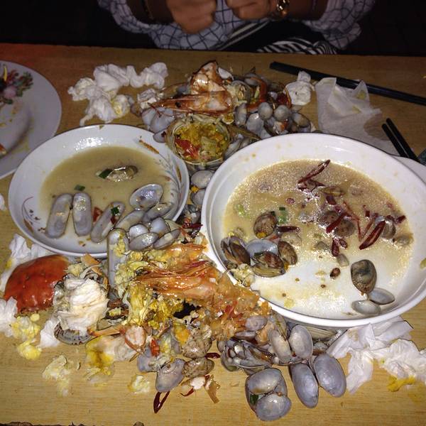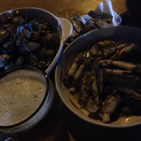 哇,不得不说的美味,我们一起去南山市场买了螃蟹,虾,还有花蛤,去了大家推荐的南山啤酒屋,要了扎啤,太好喝了,她也很能喝,哈哈