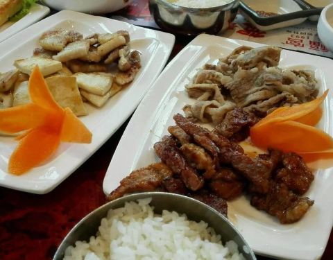 - 点了一份烤肉、石锅拌饭、芝士炒年糕,小菜给了一大堆超级丰富。还有两种蔬菜沙拉,比较丰富。 整体还可以