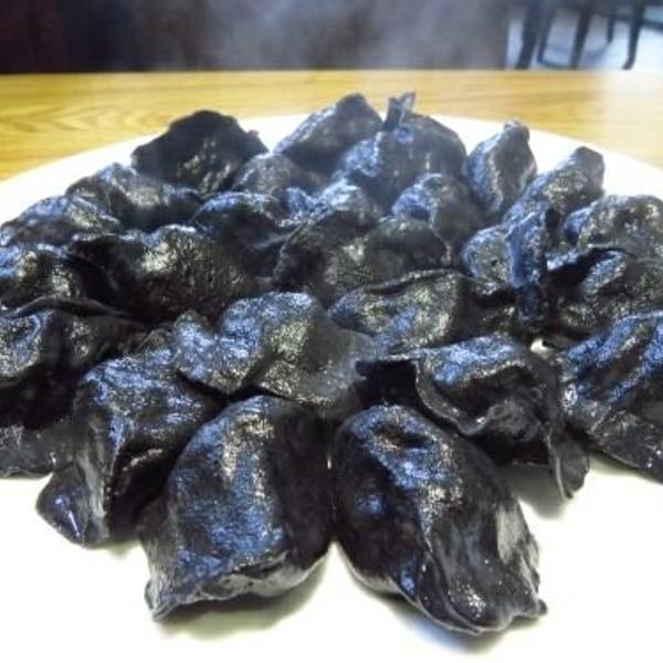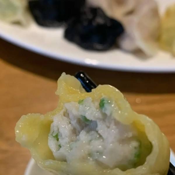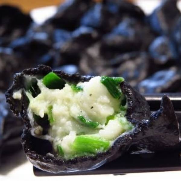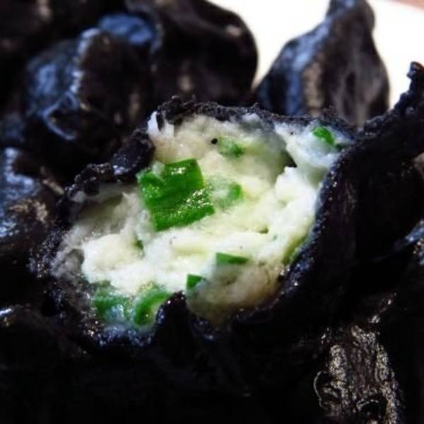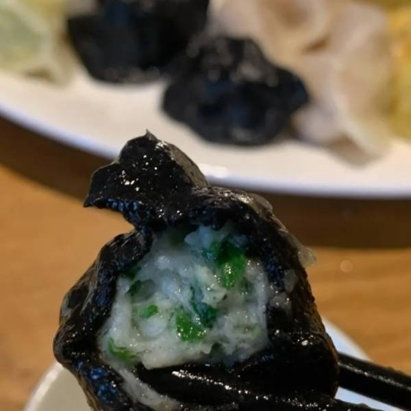 传说使用墨汁制作面皮,外黑里白的墨鱼水饺~黑皮不厚,却是意外的扎实Q弹,而内陷反其道行之,非常松软,如果咬的太快便会喷出汁来~ 内陷里加入不多的韭菜,封入滴水不漏的黑皮之中,韭菜的香味与墨鱼肉浆在鲜味十足的汁水中融合,让其充满传统韭菜饺的味道而又突显主角的风采,吃完嘴里也不会有强烈地韭菜味~ 韭香鲜甜,多汁味美,十分迷人的味道~