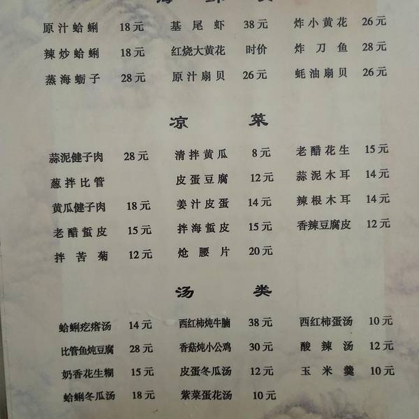 极力推荐的饭馆!我们到的时候大概10:50,已经满员了,只剩下角落里面对墙的一个小桌子,被隔起来的,应该是店里工作人员休息的地方,被我们占用了。再后来进来的顾客全部没有座位,等待要好久,最少一个小时。店内桌子太少,还好来得早,真是太幸运了!其实昨天中午要来这里吃饭的,当时已经快两点了,进去后被告知已经停业,灶也坏了。今天特意又来这里,事实证明,来这儿就餐真是非常明智的选择!价位合适,味道相当好。是一份一份做的菜,等待时间会稍微有点长,但是非常值得。比劈柴院的烧烤摊位味道好了不知道多少倍。铁板蛋豆腐30元。观察了每张桌子都点了什么菜,这个是必点的,前一天来踩点的时候也看到这个,毫不犹豫就点了,味道很清爽,新鲜的很,鱿鱼很有嚼头,吃的光光的一大盘。耗油扇贝26元。味道很足,适合重口味的我。也是很新鲜的味道,能明显感觉到。略咸。奶香花生糊15元。超级好喝,浓浓的,口感嫩滑,不知道怎么做出来的。而且这么一大盆,才15块钱!我俩使劲喝也没喝完,太实在了!这盆够四个人的量了。菜谱菜谱看看菜谱就知道这家餐厅价位多实惠,我们一路也看了不少吃饭的地方,价位都是太高,这个地方也是无意中知道的,确实值得专程过来品尝!菜量很大,我和老公两个人就两份菜,一份汤,都撑的不得了,汤还没喝完,可惜了。点菜的时候要慎重!而且最重要的,一定、一定、一定要早点来占座位!