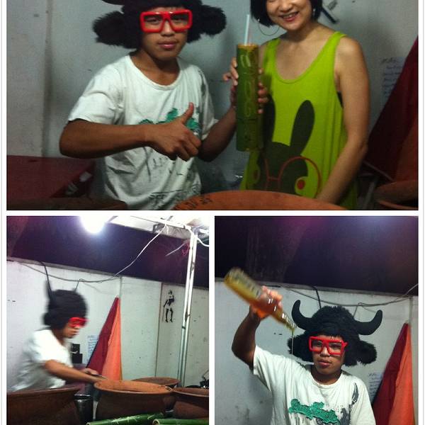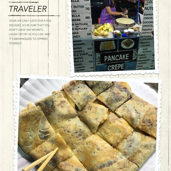 泰国的夜市是我的挚爱,在泰国似乎任何地方都有夜市,而且品质都不差。在Pai县的街边天色一暗就冒出了很多小吃摊档,煎饺、芒果糯米饭、酸辣粉吃的不亦乐乎!酸辣粉实在太辣了,必须要喝杯冰的饮料才能恢复知觉。卖冰茶的小哥打扮好有趣,这么热的天看到他带着那么厚的帽子,也要捧个场啊!用竹筒装的冰茉莉茶,一饮而尽,口唇的知觉也随之恢复。