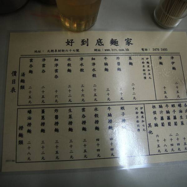 轻铁坐一站,到大棠道站下,步行1分钟就看到好到底面家的招牌,下雨就没把相机拿出来拍了 菜单,我们点了云吞面(25港刀),虾子捞面(50港刀)