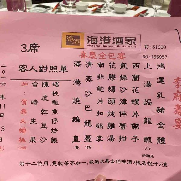 我说的这家海港酒家在蓝田,找不到蓝田的就写在这里了,坐港铁到蓝田站下车,走出站外,再坐电梯上天桥,直走,到三楼就看到海港酒家了,酒家外面设置的一般,下午六点到的,因为是周末,也能看到有人在等位子!我们是预定了房间的,一进酒家直奔包房了,酒家很大,坐位很多,包房也有几间,有的包间是用屏风相隔,灵活运用场地,酒家上菜快,菜量很足,这是其他酒家看不到的,真的很大份,菜也很好吃,当时摆的寿宴,预定的套餐,加了寿包,服务费和送两支啤酒,两扎饮料,一桌是3800元!价格偏贵一点点,但看到菜的份量,也不觉的贵,是相当的超值!海港酒家的菜品,服务,环境,菜的份量,相当的满足!